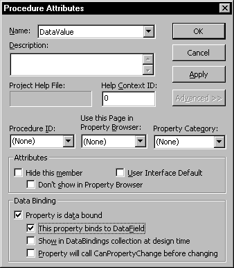 Finally, to enable your control to connect to a data control, you must designate one of the properties of your control as bindable. Binding a control to a field in the database means that whenever the bound property of your control changes, Visual Basic writes the new value back to the database field to which your control is bound.
