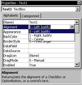 You know from working with controls in Visual Basic in the past that some properties have the ability to limit the user to a specific range of settings. For example, consider the Alignment property of a TextBox control. This property can be set to one of three numbers: zero, 1, or 2. You can't choose another value in the Property window at runtime, because Visual Basic provides a combo box for the Alignment property that limits you to these three choices.