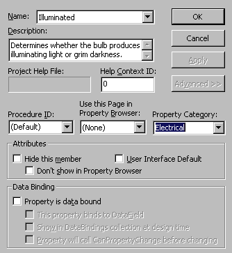 For example, you might want to create a bunch of electricity-related properties together in one group. The Wattage and Illuminated properties would be more easily accessible if they belonged to this group. To place the LightBulb control's Illuminated property in a property group, do the following: