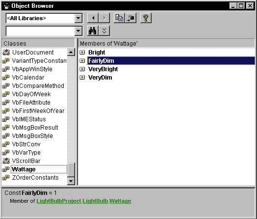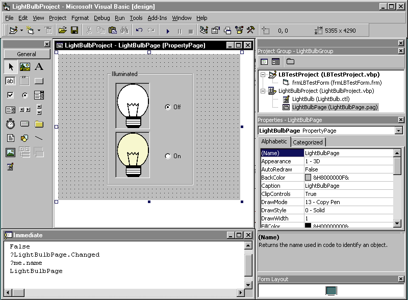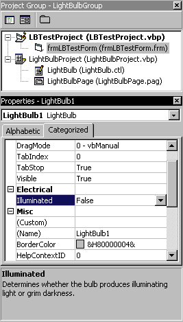The example you'll use in this chapter is the LightBulb control, which you'll find on the CD-ROM accompanying this book. The group file this project is based on is called LightBulbGroup.vbg. The version of LightBulbGroup.vbg in the \Before folder contains a minimal version of the LightBulb control, with a visual design only and no code. The version of LightBulbGroup.vbg in the \After folder contains a version of the LightBulb control that includes all the code examples in this chapter. If you want to step through the examples in this chapter one at a time as a tutorial, start by opening the version of LightBulbGroup.vbg in the \Before folder.
