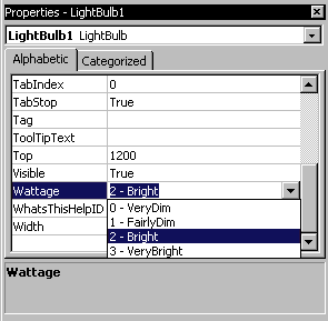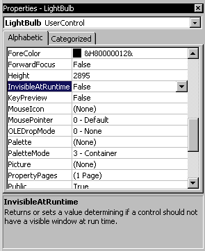 This example shows you how to create an Illuminated property for the LightBulb control. The Illuminated property is stored in a Boolean variable, mIlluminated. When the user sets the Illuminated property to True, the LightBulb control displays the illuminated light bulb graphic. When the Illuminated property is set to False, the LightBulb displays the dimmed light bulb graphic.
