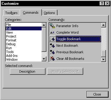 There are four toolbars in Visual Basic: Standard, Edit, Form Editor, and Debug. Visual Basic will generally display whatever toolbar is appropriate for what you're doing. But there are situations where you might want to add a frequently used command to an existing VB toolbar. For example, say you use the Toggle Bookmark command frequently and you'd like the command to appear on the toolbar instead of in the Edit menu. To add a Bookmark button to the Visual Basic toolbar: