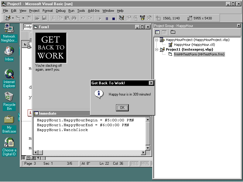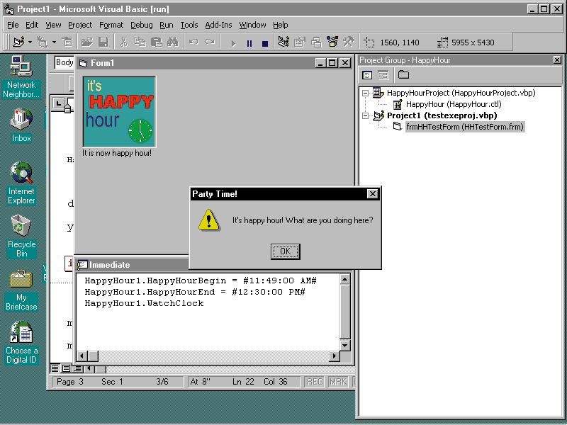 The message box displayed by the HappyHour control depends on what time it is. If it is currently happy hour, you'll see the message box displayed as in Figure 6.1.