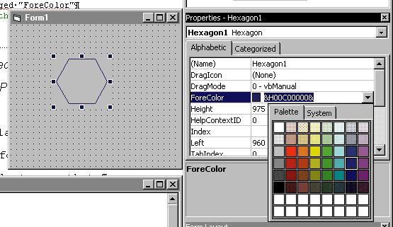 If you place an instance of the Hexagon control onto an EXE project form and then change its ForeColor property, you should be able to see that you can change the color of the control to any Windows color. The control should look like Figure 9.5.